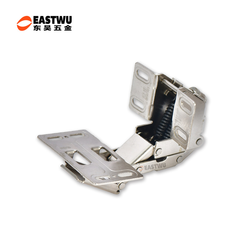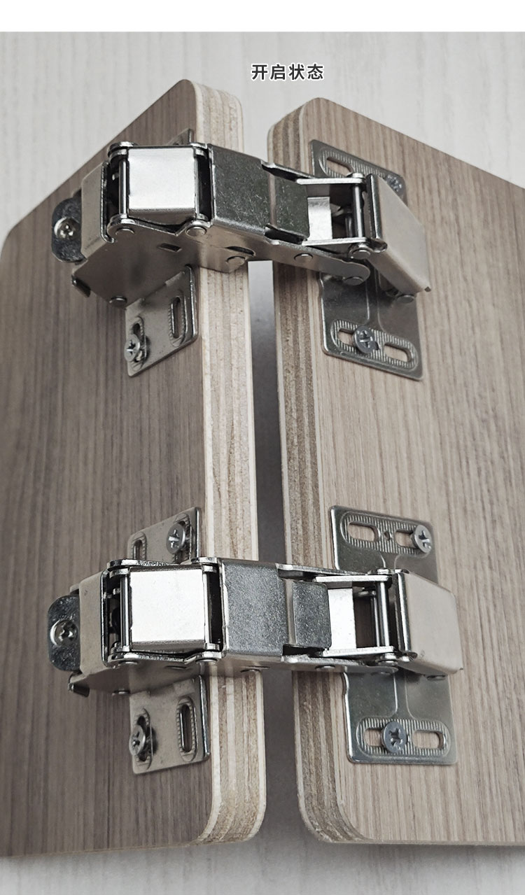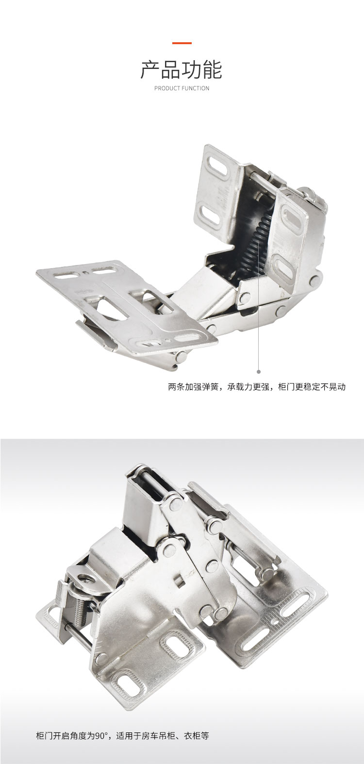 冷轧钢房车吊柜铰链 免开孔 无需加装气撑 柜门自动撑起 适用门厚15-18mm 开启角度90° 使用范围房车吊柜、衣柜等