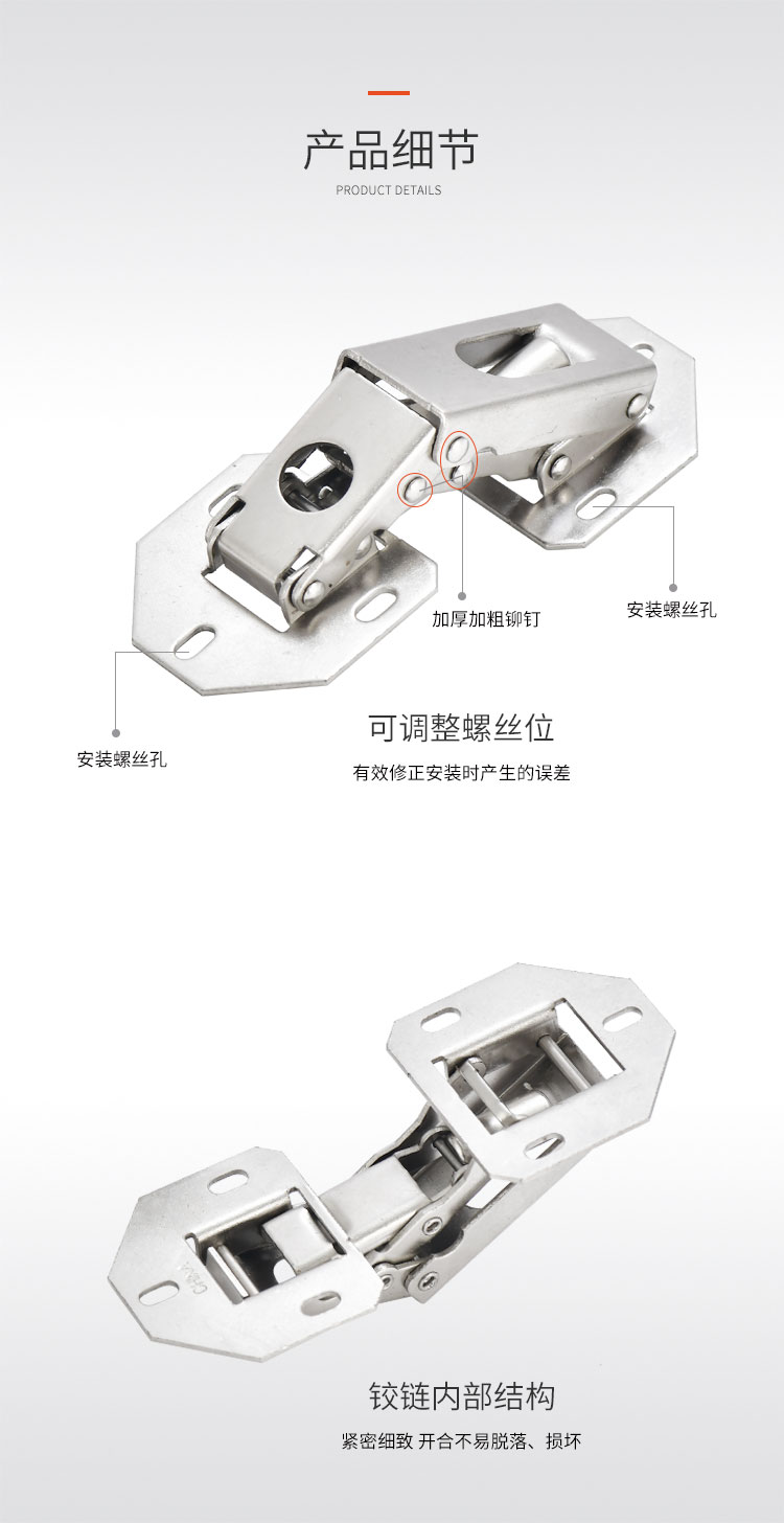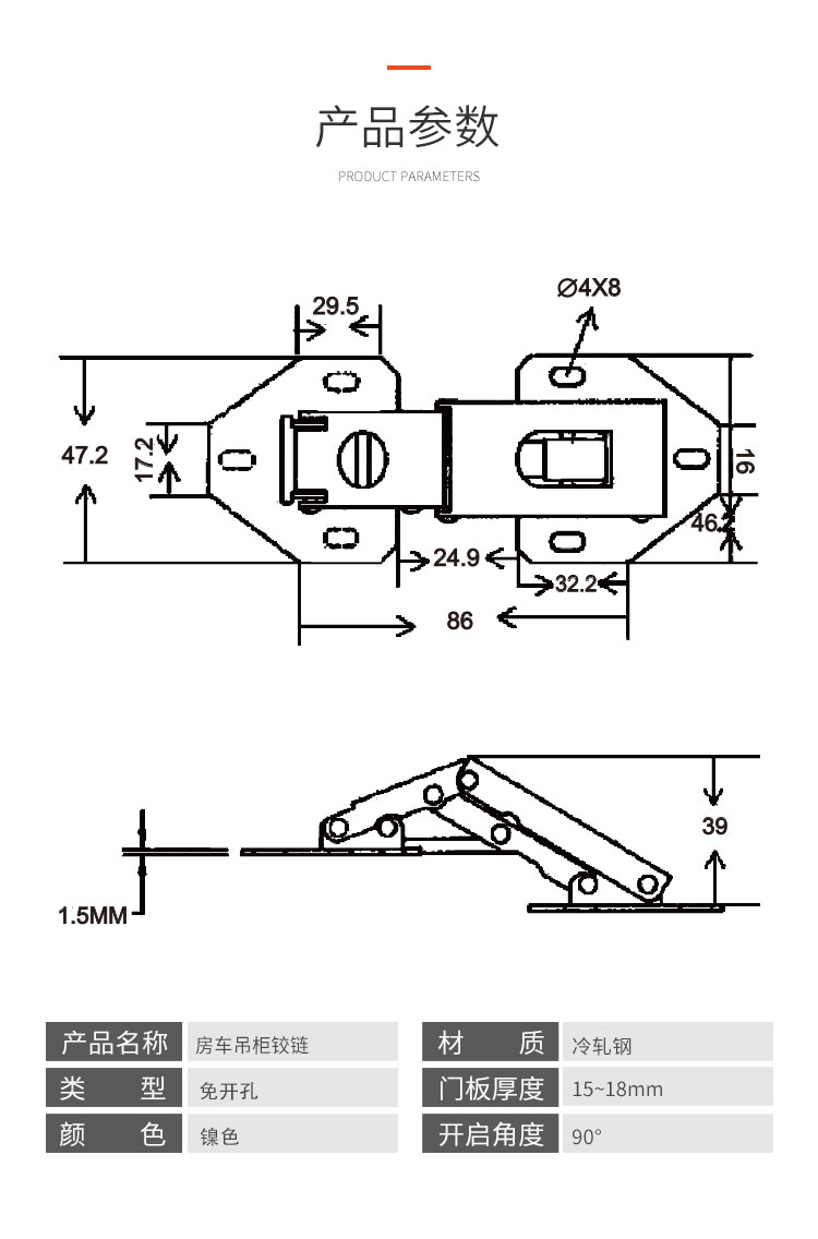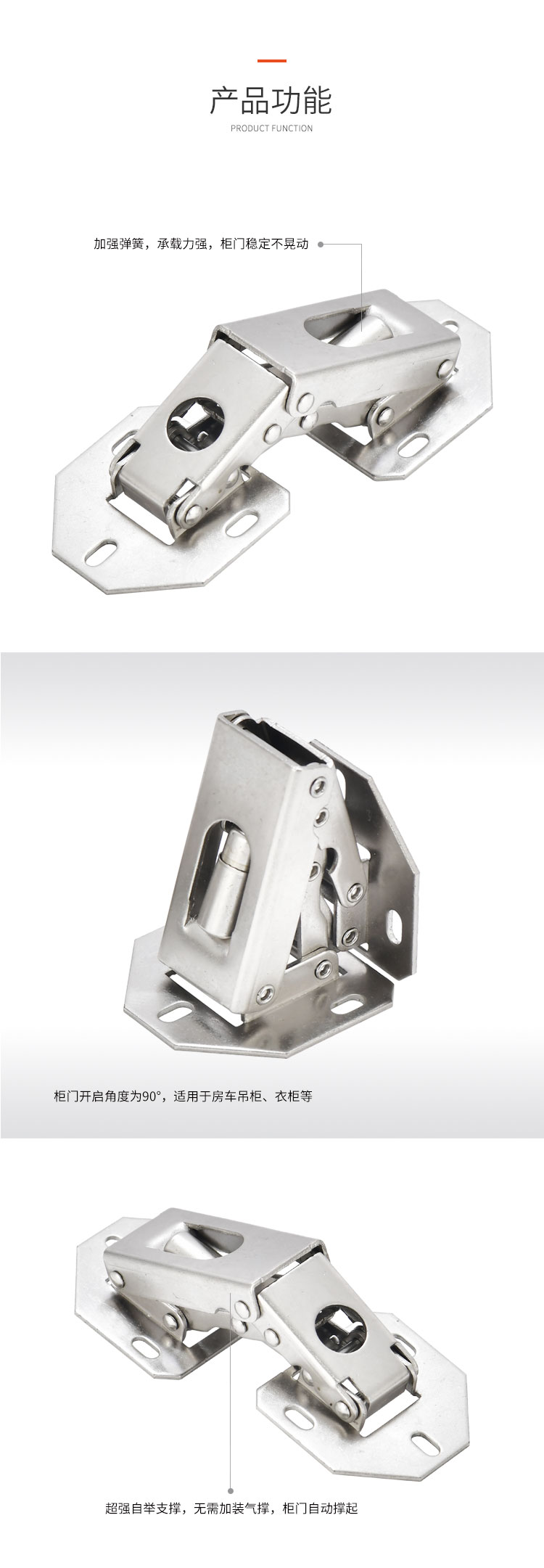冷轧钢房车吊柜铰链 免开孔 无需加装气撑 柜门自动撑起 适用门厚15-18mm 开启角度90° 使用范围房车吊柜、衣柜等