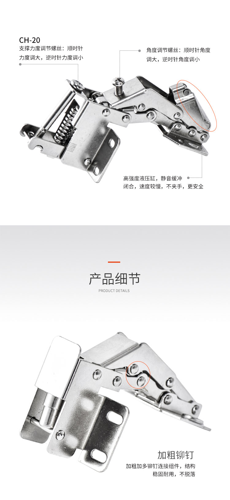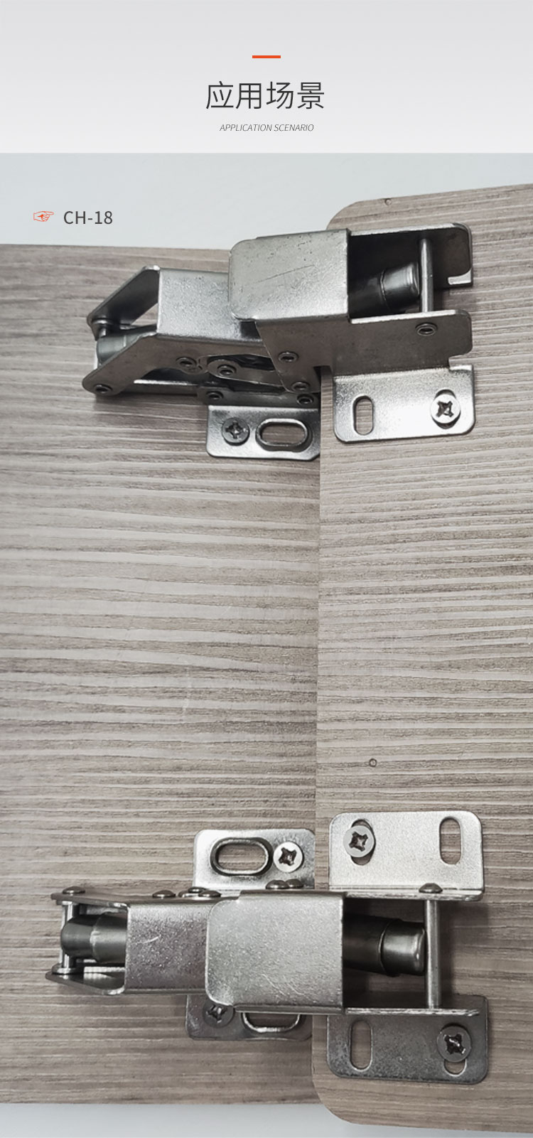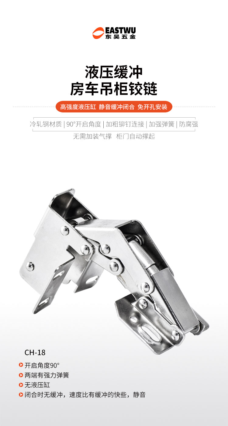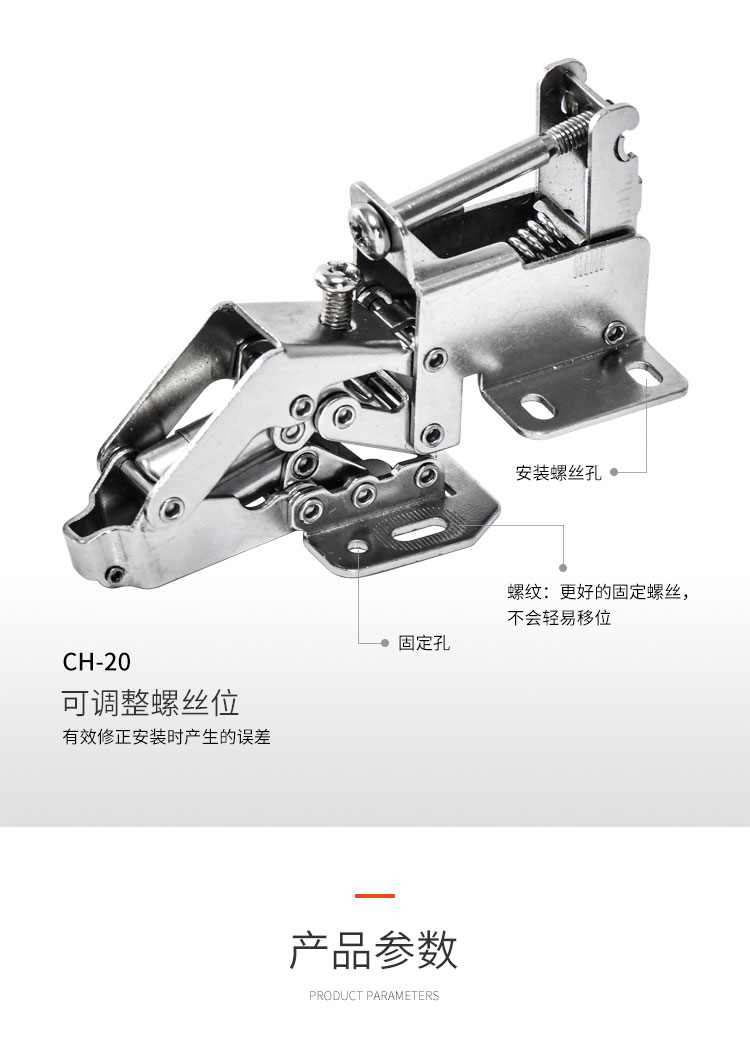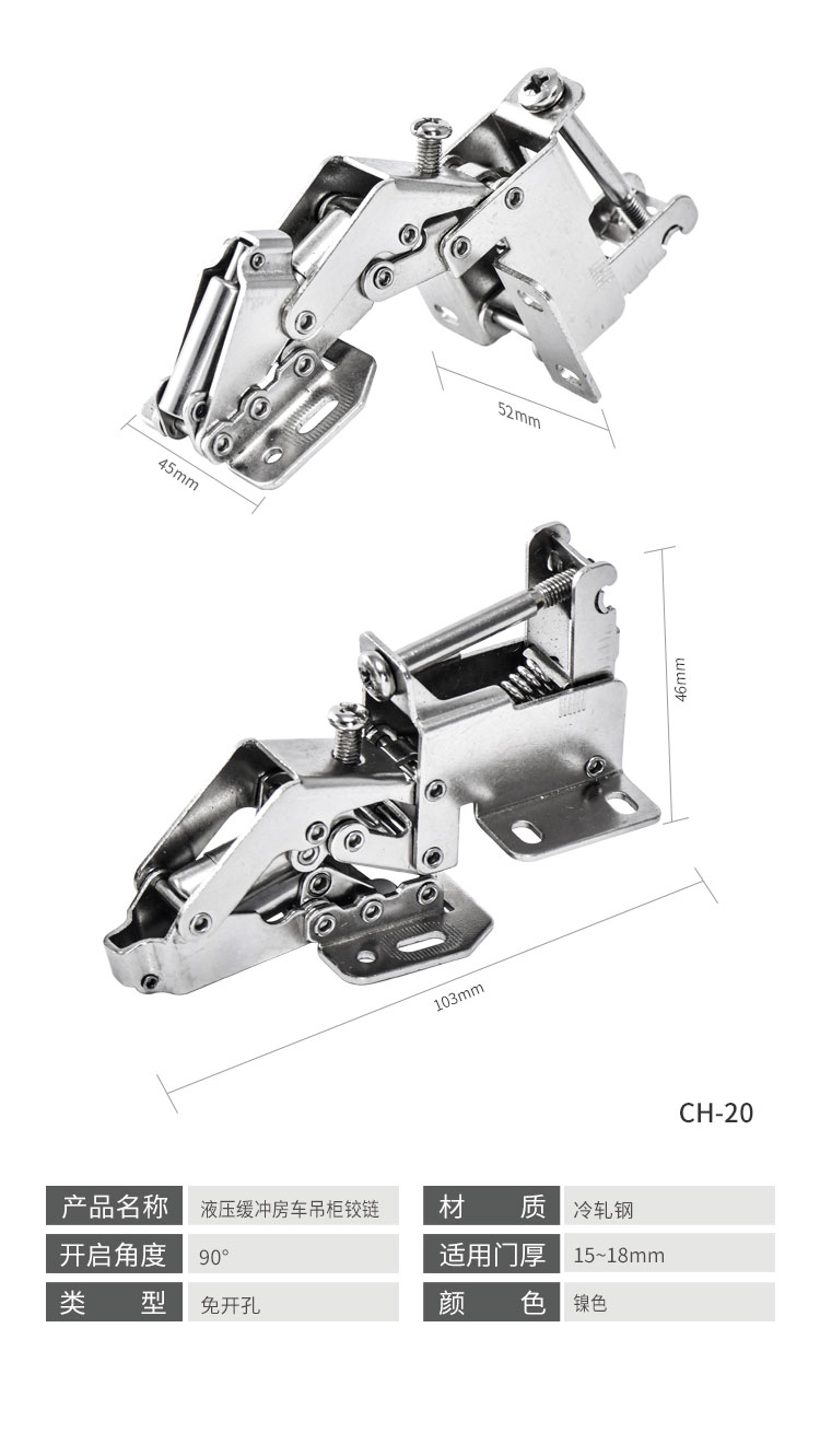 材质冷轧钢,镍色,开启角度90°,适合门厚15-18mm,适用于90°转角柜,层叠门板安装,开启L型,带调节力度和开启角度螺丝