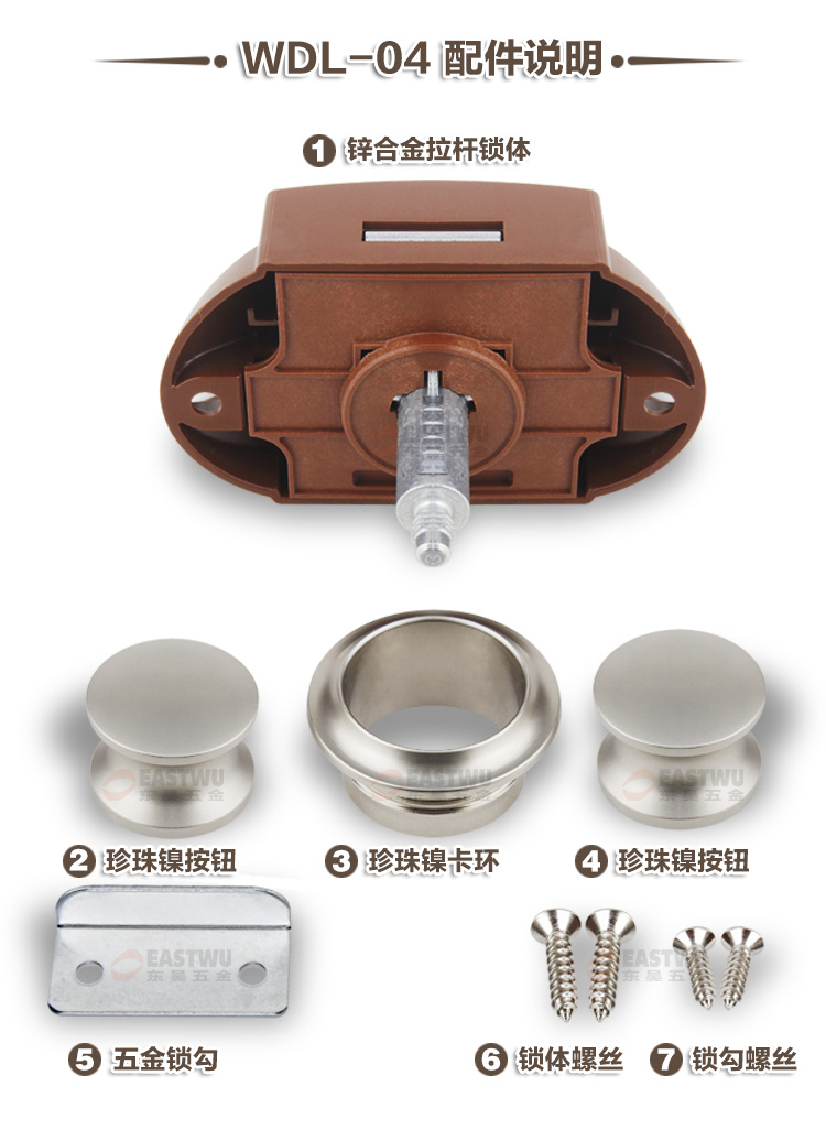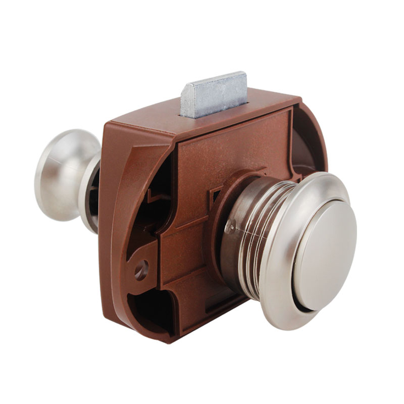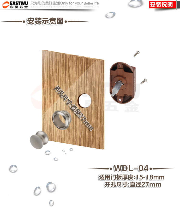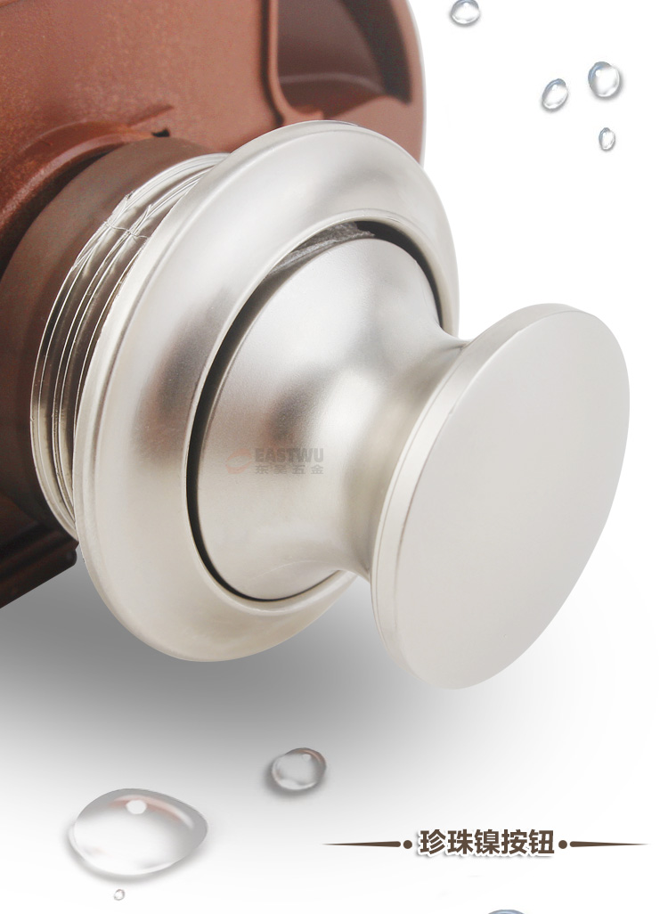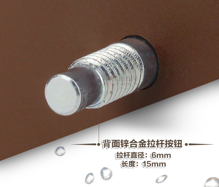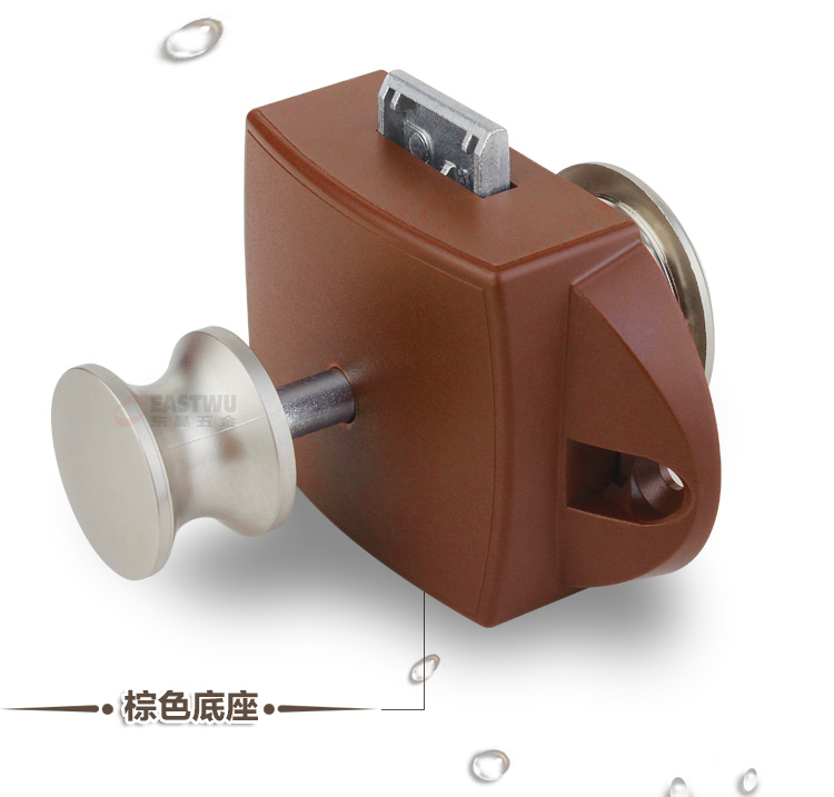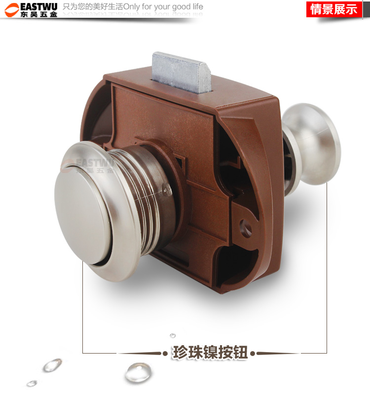 ·材质:珍珠镍按钮 棕色底座 锌合金拉杆按钮锁 适合门板厚度:15~18mm 开孔尺寸:Φ27mm