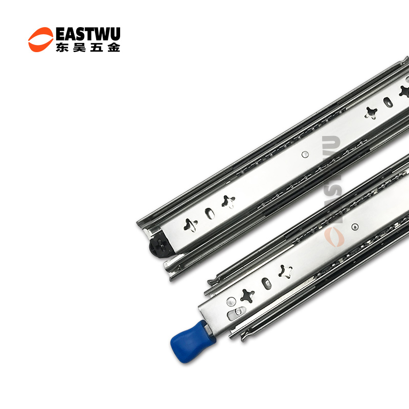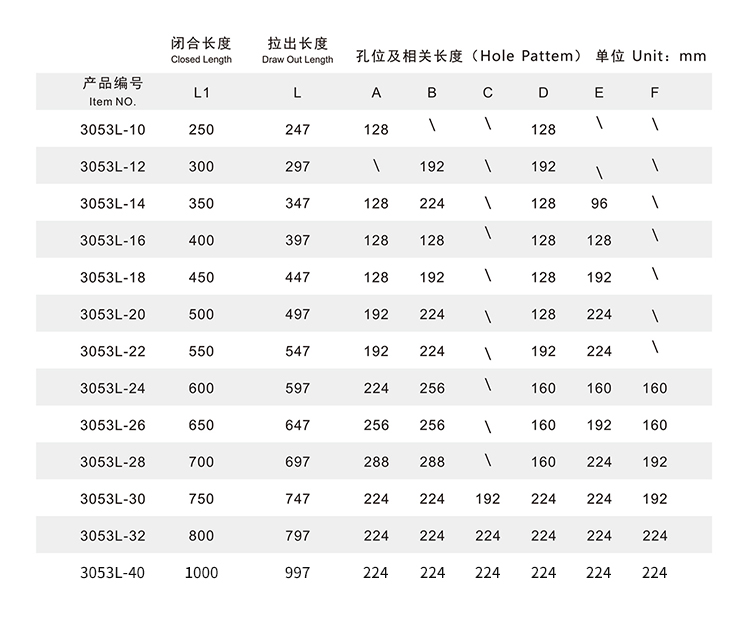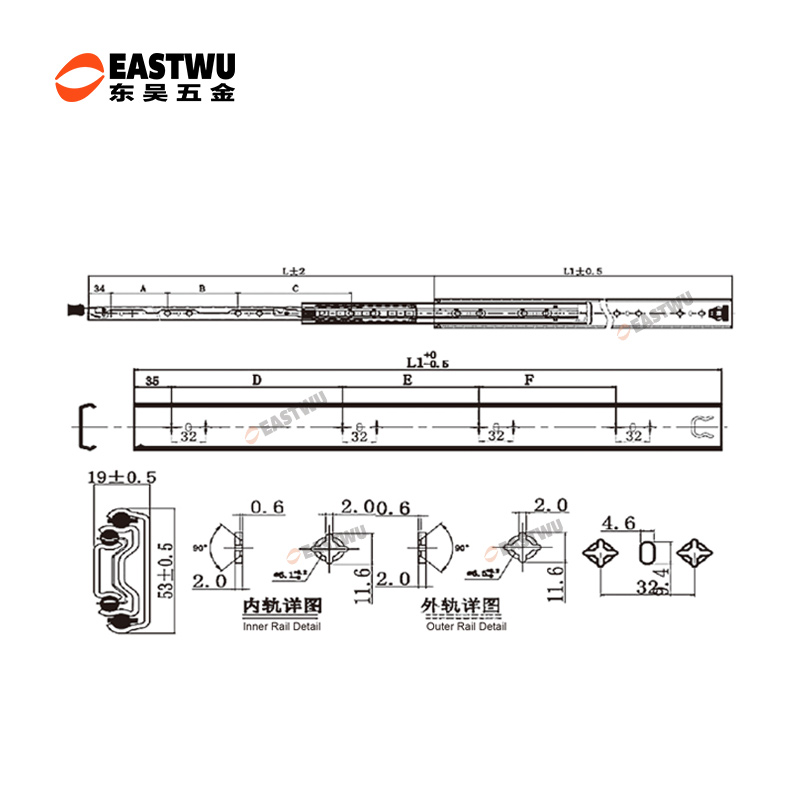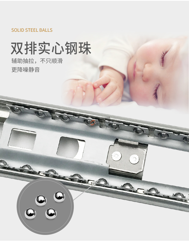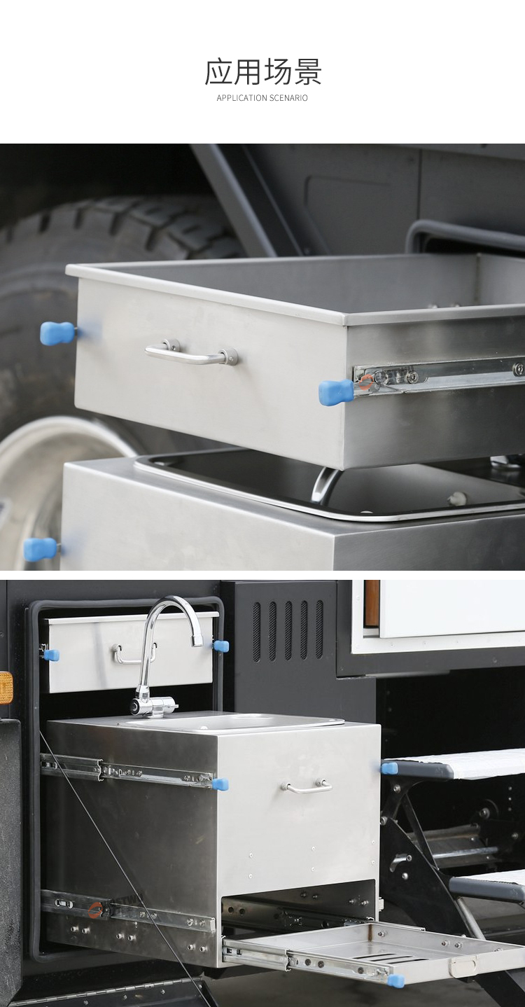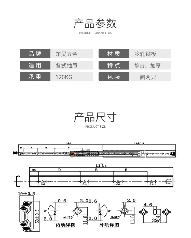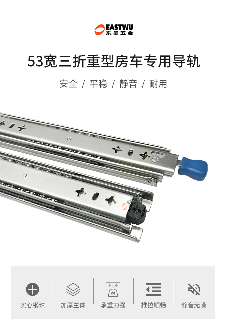 ·适用房车橱柜、工业抽屉 安装在抽屉侧面 带锁导轨 承重:120KG 长度:250-1800mm 导轨宽度:53mm 导轨厚度:19mm 材料厚度:2.0mm 使用范围:房车橱柜、工业抽屉等