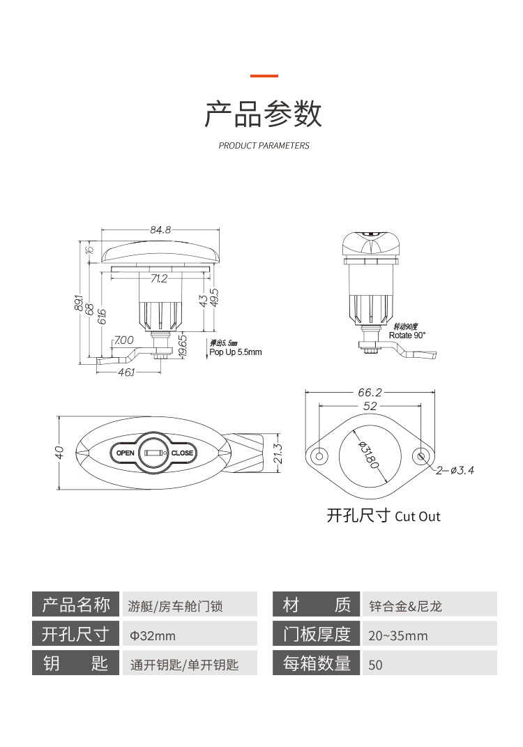 特点:可定制与房车门锁一样的钥匙,一把钥匙就可以开房车上面的所有舱门锁与门锁。开孔尺寸φ32mm 锌合金&尼龙材质 适用门厚20-35mm