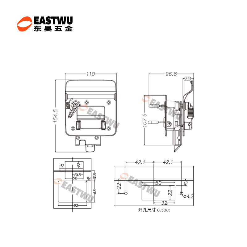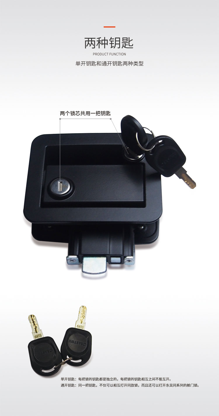·材质:锌合金 ·钥匙:可订购分组钥匙或与2991舱门锁通开的钥匙 ·配件:螺丝&挡片1锁配2个钥匙 ·开孔尺寸:92X68mm 两种钥匙,一种是通开钥匙,一种是单开钥匙,自由选择,结构牢固,