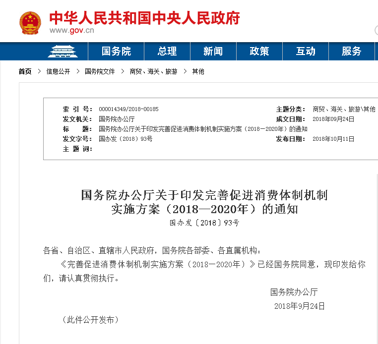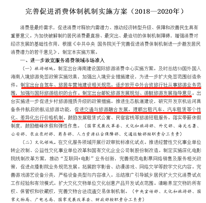 2018年10月11日,国务院印发了关于《完善促进消费体制机制实施方案(2018—2020年)》的通知。《通知》指出,将加快制定自驾车、旅居车营地建设相关规范。逐步放开中外合资旅行社从事旅游业务范围,加强与国际旅游组织的合作。